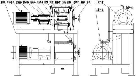 該機主要是由機架、傳動電機、軸承座、主軸、篩網、刀片、進料口、出漿鬥、筒體等重要部件組成。