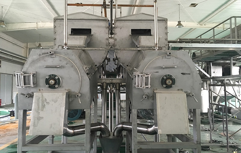 6. 去核製漿:經過破碎機初破碎的紅棗通過螺杆泵進入去核製漿機的男女生打扑克羞羞视频免费网站室內,通過男女生打扑克羞羞视频免费网站葉片的高速旋轉作用下使物料獲得離心力而拋向篩網,物料在男女生打扑克羞羞视频免费网站葉片與篩網 進行產生相對運動的過程中因受到離心力以及揉搓作用而被進一步打擊成漿,物料經篩網孔進入收集器,再由螺杆泵輸送至下一工序,而渣皮、果核等則由出渣鬥排出。