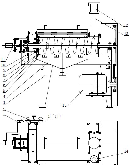 1、電磁閥  2、油水分離器  3、機架  4、積汁槽  5、出渣口  6、骨架  7、襯網  8、濾網  9、螺旋軸  10、頂盤  11、氣缸  12、透氣蓋  13、進料箱  14、進料口  15、傳動電機