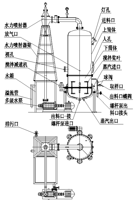 該機主要由筒體、蒸汽加熱室、多級水泵、減速機、水力噴射器、水箱等組成。