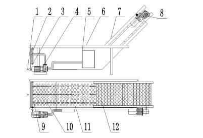 1、排汙閥 2、衝洗總管 3、水泡總管 4、循環水泵 5、水過濾箱 6、水箱 7、提升機架 8、調速減速機 9、衝洗噴嘴 10、水泡支管 11、防沉網 12、提升網帶