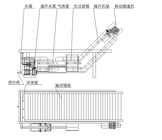 該機由水箱、提升機、循環衝洗水泵、傳動部分等部件組成,工作時物料直接被倒在輸送鏈板上,在水箱中輸送;而又由於輸送鏈板底部設有氣泡管,使物料產生翻滾,從而清洗物料。水箱內的水經過水過濾箱過濾後,由循環水泵通向衝浪管和氣泡管。本機也可根據用戶要求在提升段和水箱上部加設噴淋管。