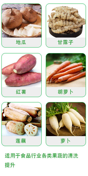 該設備適用於球形或長條圓形的果蔬清洗。果蔬原料在毛刷旋轉的推動下向前移動,洗淨度高。