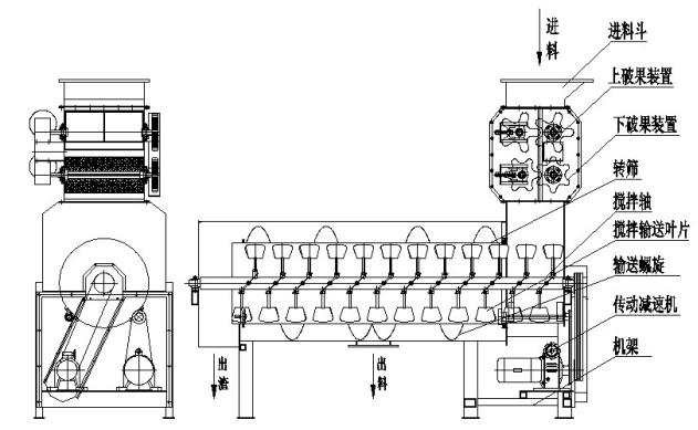 該石榴破殼分離機主要由進料鬥、上破果裝置、下破果裝置、轉篩、攪拌軸、輸送螺旋、機架等部件組成。本機除傳動部分外其餘為不鏽鋼製造,攪拌軸無級調速。