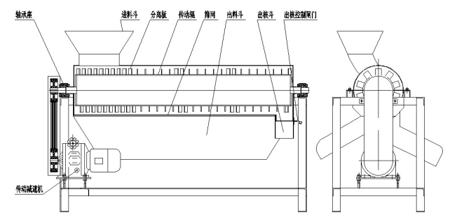 該機由傳動減速機、軸承座、機架、進料鬥、傳動輥、分離板、出料鬥、出核鬥等部件組成。工作原理:物料由進料鬥進入去核工作室,由於去核室內輥子上置有不同角度的分離板,使水果的果肉與果核分離。被分離的果肉從篩網孔中落入出料鬥中,果核則由數個分離板組成的螺旋,向出核處移動由出核鬥排出,篩網和分離板之間的間隙可試處理物料核的大小而定。