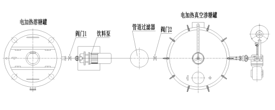 3、蔗糖溶解後就可打開溶糖罐下麵的閥門1,使糖汁流入飲料泵,再分別打開閥2,起動飲料泵使其工作,在飲料泵離心力的作用下,通過雙聯過濾器,使糖汁得到充分的過濾,分別流入滲糖係統中;