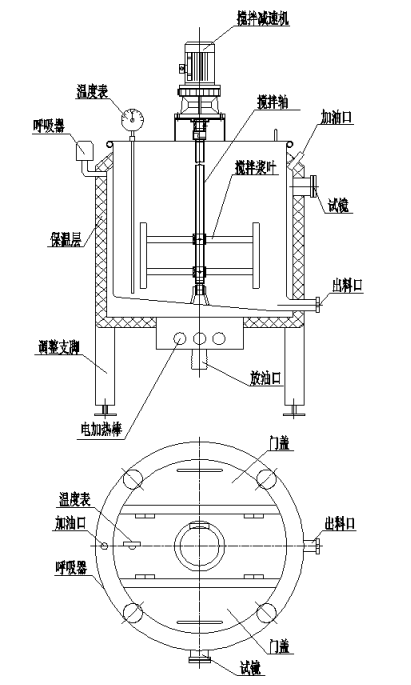 該機主要由罐體、攪拌減速機、攪拌軸、攪拌槳葉、調整支腳、保溫層、出料口等重要部分組成。其主要工作原理:從加油口中加入水或者導熱油(直到能從試鏡看到液體為止),罐體裏麵加入物料或者純水(嚴禁幹燒),接通電加熱棒電源,減速機帶動攪拌軸轉動,將物料均勻地混合。該機整體采用不鏽鋼製作,結構簡單、操作方便,具體可根據客戶要求設計儲存容積量,也可設置半開門式或對開門式。