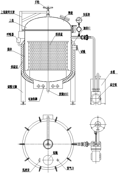 其主要工作原理:從加油口中加入水或者導熱油(直到能從試鏡看到液體為止),水箱中加滿水;打開上蓋鎖緊開關,旋轉支架將上蓋移到一邊,吊出浸提藍,裝滿物料後放入罐內,加入糖液,糖液默入浸提藍後停止加入糖液;將上蓋移動到筒體上方,鎖緊開關,關閉進糖液閥門;啟動真空泵及電加熱就可以工作。