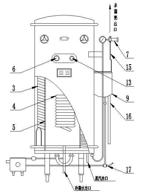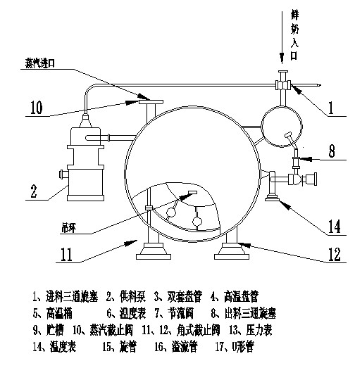 超高溫瞬時滅菌機的結構見圖1,在主機內裝著壓力容器--高溫桶(5)、用作充盛壓力蒸汽。桶外的主要設置時螺旋形雙套管(3),用作對進、出物料的冷熱交換;桶內的主要設置是螺旋形單管(4),用作間接受熱。