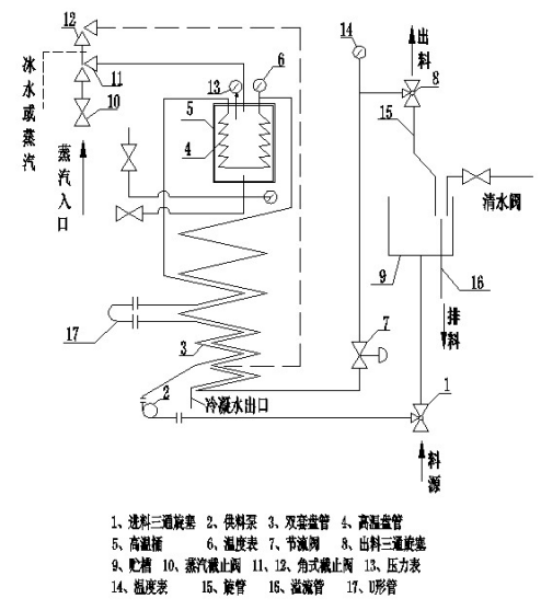 節流閥(7)是可以調節的,一方麵使物料維持在一定的壓力之下,讓其沸點溫度提高,以防止淡化;另一方麵,也作調節流量用。物料zui後經三通旋塞(8)出料。該旋塞下端接著旋管(15)、其出口對著貯槽(9),當需要時,可旋動旋管對轉溢流管(16)。進料三通旋塞(1)的上端與貯槽(9)接通,下端則與料源管道相連接。