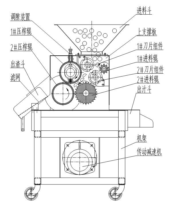 該機主要由機架、減速機、進料鬥、切刀組件兩組、進料輥兩組、壓榨輥兩組、出汁鬥、出渣口等部件組成。其主要工作原理:接通電源,將物料倒入進料鬥中,1#進料輥輔助進料,1#2#兩組刀片切片水果,然後2#進料輥將水果送入1#2#壓榨輥之間進行壓榨(1#壓榨輥可由調隙裝置上下調節,從而控製水果出汁量),果汁和部分果肉由出汁鬥排出,皮和渣由出渣鬥排出,從而達到榨汁的目的。該設備除傳動部件外其餘均為不鏽鋼製作。
